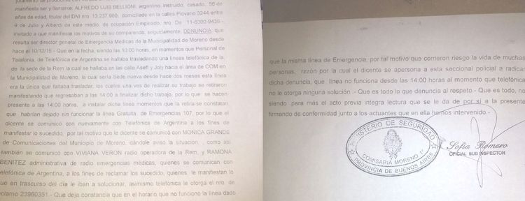La carga pública se lleva. Es una mochila que no puede ni debe abandonarse en el viaje de exploración y riesgos que entraña una responsable función pública. Cuando ésta acción se cumple no es merecedora de agasajos o felicitaciones, en el mejor de los casos un ejemplo de cómo se llegó a naturalizar la no carga pública. El Director de la Red de Emergencias Médicas (REM) se presentó en la justicia el día 24 de mayo y denunció que la empresa Telefónica de Argentina cortó, por reparaciones, la línea Gratuita 107 que permite a los habitantes del distrito de Moreno solicitar la ayuda urgente. La descripción asentada en la Comisaría Moreno 1ª por el señor Alfredo Luis Bellioni, Director de la REM, es la siguiente: "Que siendo las 10 horas y en momentos que personal de Telefónica de Argentina se hallaba trasladando líneas telefónicas de la sede de la REM (Asseff y Joly) hacia el área del COM (Asconapé 51), el personal se retiró manifestando que regresaban a las 14 horas para concluir el trabajo. A esa hora y cuando se retiraban se constata que habrían dejado sin funcionar a la línea GRATUITA de Emergencias 107". La denuncia de Bellioni, argentino, instruido de 56 años de edad, agrega: "Se comunicó con Mónica Grande del área de Comunicaciones del Municipio de Moreno dándole aviso de la situación, como así también se comunicó con Viviana Verón radio operadora de la REM y con Ramona Benítez, administrativa de radio de emergencias médicas, quienes se comunican con Telefónica de Argentina a los fines de reclamar por lo sucedido (Nº de reclamo 23960351). Deja constancia que desde el momento en que dejó de funcionar el 107 corrieron riesgo de vida muchas personas.
