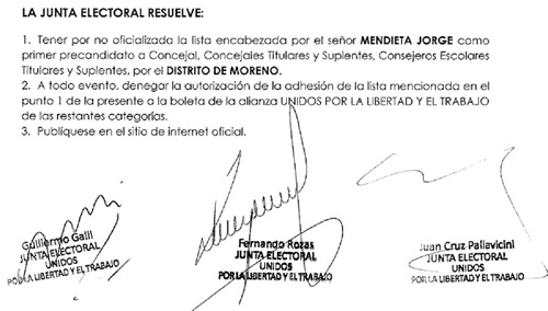 Los apoderados del Frente Unidos por la Libertad y el Trabajo, Guillermo Galli, Fernando Rozas y Juan Cruz Pallavicini, rechazaron la lista presentada por el actual concejal y ex presidente del H.C.D. El argumento está en que la lista "no cumple con el requisito de integración plural de los (…)