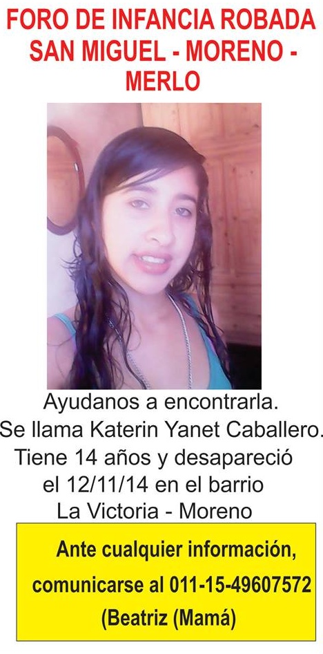 Una niña de 14 años de edad está desaparecida desde el día 12 de noviembre. Katerin Yanet Caballero le envió un mensaje de texto a su madre diciéndole que se iba de la casa. La vivienda está ubicada en el barrio La Victoria. Interviene y acompaña a Beatriz, madre de la niña, el Foro de Infancia Robada de San Miguel - Moreno - Merlo. En diálogo con el programa radial Recorte Informativo (FM Moreno 90.1), Beatriz explicó: "Mi hija desapareció el día 12 de Noviembre a la tarde. No sé nada de mi hija, con quien está, donde esta. Al día siguiente hice la denuncia a la comisaria y de ahí a una semana fui a la fiscalía porque todavía no habían pasado la denuncia".