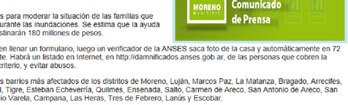 Quedó en evidencia que la acción del municipio que comanda West para atender a las víctimas de la inundación no articula con ANSES, es decir, con la jefatura de ese organismo a nivel local. Es claro que ante el desastre llamado "natural", las distancias políticas que separan a Mariano West de Walter Festa no sólo no se acortaron sino que tienen una mayor expansión. Hubo cruces por la entrega de un certificado emitido por Defensa Civil Moreno Municipio (Ver http://www.desalambrar.com.ar/La-interna-del-oficialismo-o-la) que no indicaba en ningún párrafo que era un documento para presentarlo ante el organismo sino "ante quien corresponda". Pero persiste la información equivocada, el dato inexacto que no contempla la urgencia sino que la toma desde cierta temeridad. En la página oficial del municipio se sostiene al día de hoy un comunicado de prensa fechado el 5 de noviembre con el título medidas para los damnificados por las inundaciones. El gobierno de West explica allí cómo es el procedimiento y afirma: "El procedimiento se basa, en primer lugar, en llenar un formulario, luego un verificador de la ANSES saca foto de la casa y automáticamente en 72 horas se cobra la prestación correspondiente. Habrá un listado en Internet, en http://damnificados.anses.gob.ar, de las personas que cobren la asistencia para que sea transparente, con criterio, y evitar abusos".