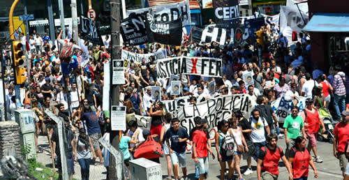 "Estamos llegando a la calle Indart, en Indart 106 se instaló el destacamento policial de Lomas del Mirador, el mismo fue instalado por un pedido de más seguridad de un grupo nucleado desde un foro de seguridad llamado Galoni. En el 2007 se inauguró esa casa destacamento que debía ser una mera base de operaciones de la comisaria Nº 8, ex centro clandestino de detención y tortura. En este lugar se llevaron adelante detenciones arbitrarias, este lugar no tenia instalaciones para tener detenidos y sin embargo los jóvenes de los barrios humildes eran detenidos en la cocina del destacamento de Lomas del Mirador comprobado en la causa judicial en donde se investigó la desaparición de Luciano. Escuchen esto que es lo más aberrante y lo más indignante, y escuchen sobre todo los vecinos del barrio de Lomas del Mirador, ese destacamento policial tenia libros de guardia que fueron peritados cuando Luciano desapareció, los resultados que arrojaron los peritajes dieron que las hojas del libro de guardia, de un documento sumamente importante, estaban arrancadas, algunas tenían hojas con tachaduras, borraduras y enmiendas. Los pibes que eran detenidos en este lugar en algunos casos no eran anotados, como Luciano y así la Bonaerense va perfeccionando sus lógicas de desaparecer. Este lugar hace muy poco fue expropiado, hace muy poco nosotros tenemos la llave de ese ex destacamento policial. Ese lugar se va convertir en un espacio de memoria social y cultural que va a llevar el nombre de un pibe de un barrio humilde, ese espacio se va llamar Luciano Arruga en memoria de un villero que se negó a robar para la Policía Bonaerense, en memoria de un pibe que estuvo desaparecido por haberse negado a robar para la policía".