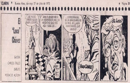 Por Fernando Ochoa. — El 25 de julio de 1975, en el diario Clarín, apareció por primera vez, Hugo Chávez, más conocido como el “Loco”. El personaje es un periodista, chanta porteño, que tiene un gran amor por el Racing Club. Al mes siguiente de su edición, la tira de Carlos Trillo y Horacio Altuna pasó de la penúltima página a la contratapa. Es evidente y hay que remarcar que el Loco Chávez, no es un periodista comprometido con la realidad que lo rodea. Lejos está él de entender al periodismo como un arma de fuego para combatir al opresor. En las tiras publicadas se observa que hay una gran distancia con la historia de vida de hombres como Rodolfo Walsh o Jorge Ricardo Masetti, que decidieron dejar de ser meros redactores de la realidad, para ser protagonistas. El Loco Chávez es un personaje que rescata el costumbrismo argento y vive las peripecias de una clase media que se considera el único sujeto representante de la modernidad. Pese a estos elementos retóricos, se convirtió en una de las historietas más populares de la década del 70 y 80.